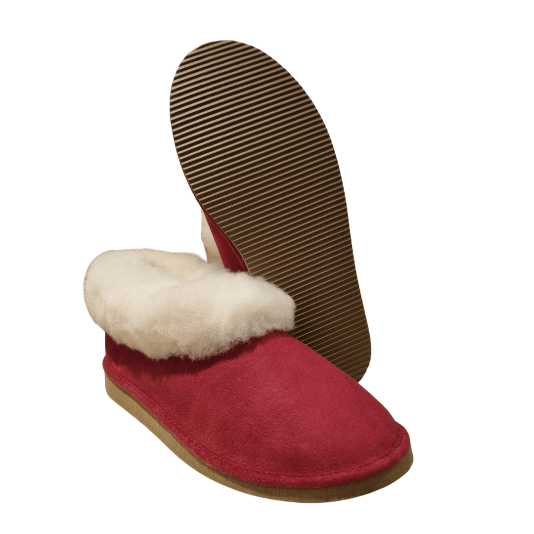 Chaussons fourrés en peau de mouton 100% Mérinos couleur rouge.